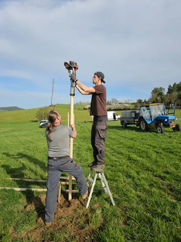 Zatloukejte kůly ze strany východní vůči stromu. Pokud je půda tvrdá (TTP), práce trvá déle. Orná půda je snazší.