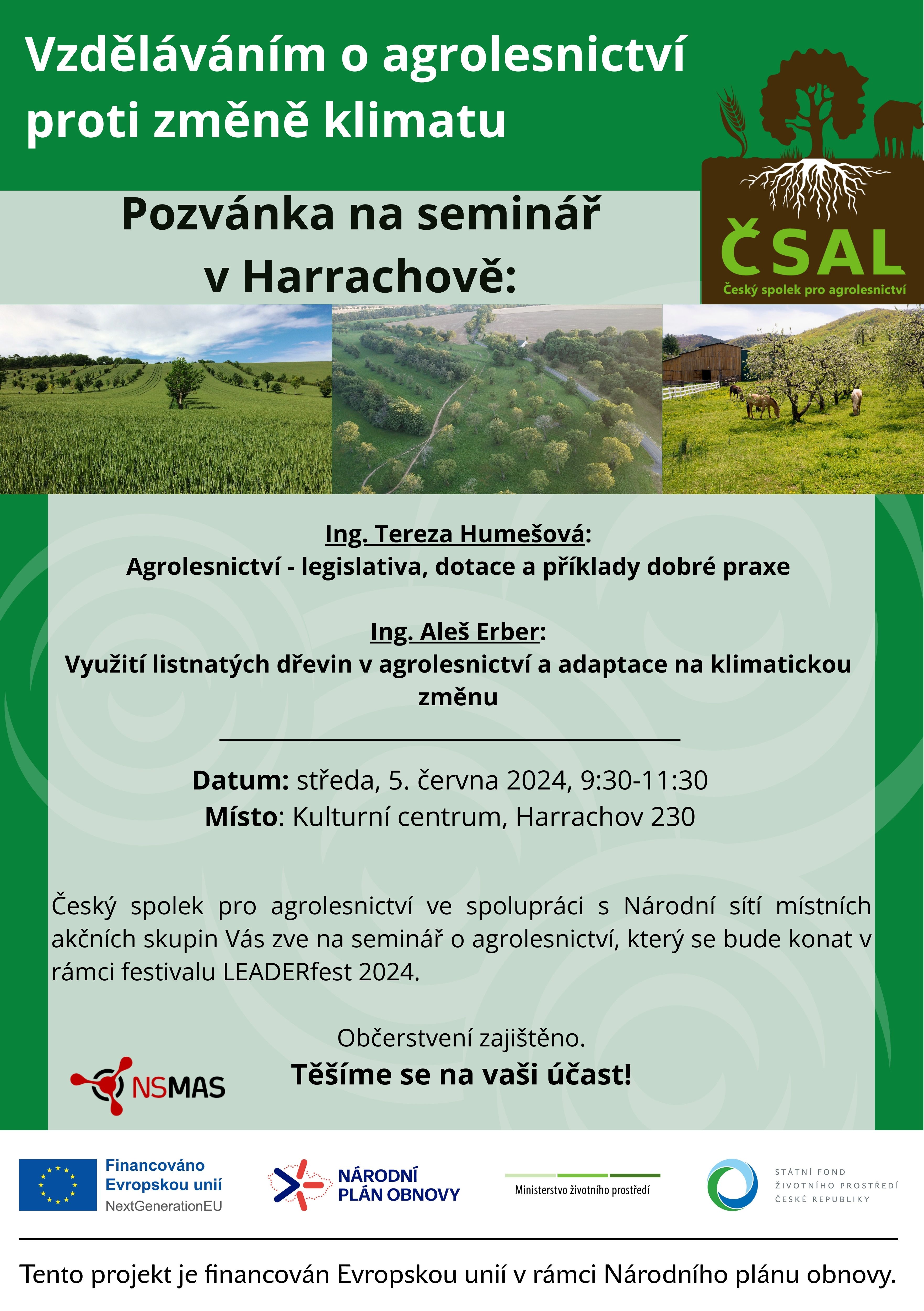 Zveme Vás na odborný seminář o agrolesnictví, který se uskuteční ve středu 5. června od 9:30 v Kulturním centru v Harrachově v rámci festivalu LEADERfest 2024. Ing. Tereza Humešová představí legislativní rámec, dotační možnosti a příklady dobré praxe. Ing. Aleš Erber se zaměří na využití listnatých dřevin v agrolesnických systémech a jejich roli v adaptaci na klimatickou změnu.